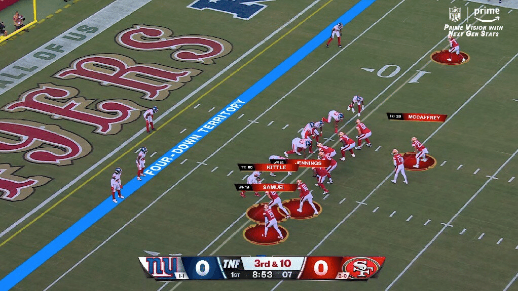 以前は「Maddenっぽく試合が観れる」程度でしたが、ここ最近は“Prime Insights”と呼ばれる新しいAI機能が次々と追加されています。「10年目のベテランのように試合を観よう」とTNFプロデューサーのSam Schwartzsteinが語るように、僕のようなプレー経験のない素人でもこれがあることで戦術等の解像度が上がって面白い。以下にいくつか例を挙げます。