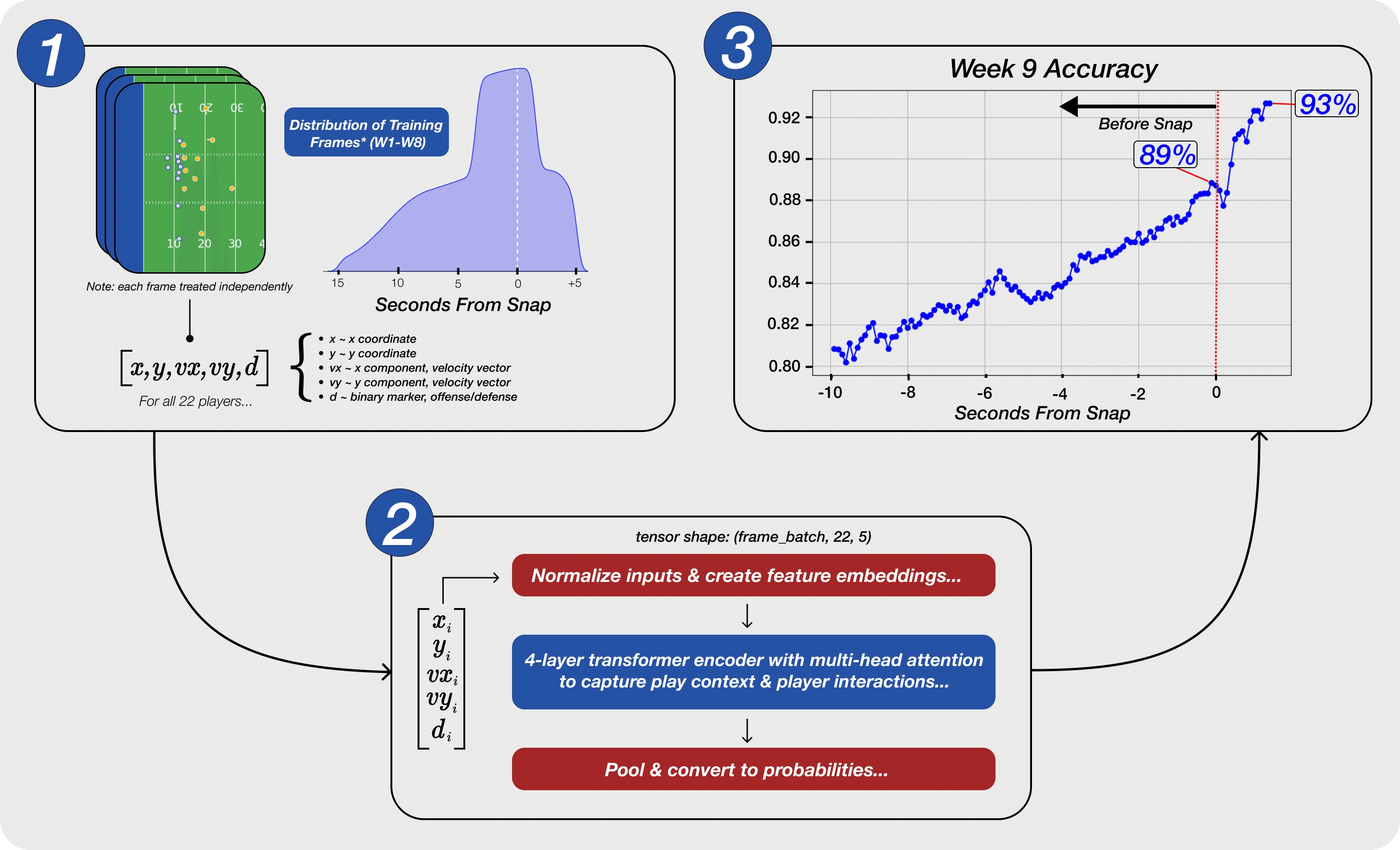 いつもに増して前置きが長かったですが、そんなトレンドを受けてか、毎年開催され、Next Gen Statsなどが提供したトラッキングデータを元に決められたお題で競い合うデータコンペのNFL Big Data Bowlでも、2025年度のテーマは「プレスナップ、ポストスナップ予測」でした(「Big data bowlとは?」という話は昨年の優勝チーム紹介の記事を参照してください)。 今回はこちらで優勝を果たしたチームの研究「Exposing Coverage Tells in the Presnap**(プレスナップでカバーを見破る)**」を紹介したいと思います。要約すると「**スナップ時点で、マンカバーorゾーンカバーを9割見破るAIを作ったよ」**という成果です。 https://www.kaggle.com/code/smitbajaj/exposing-coverage-tells-in-the-presnap