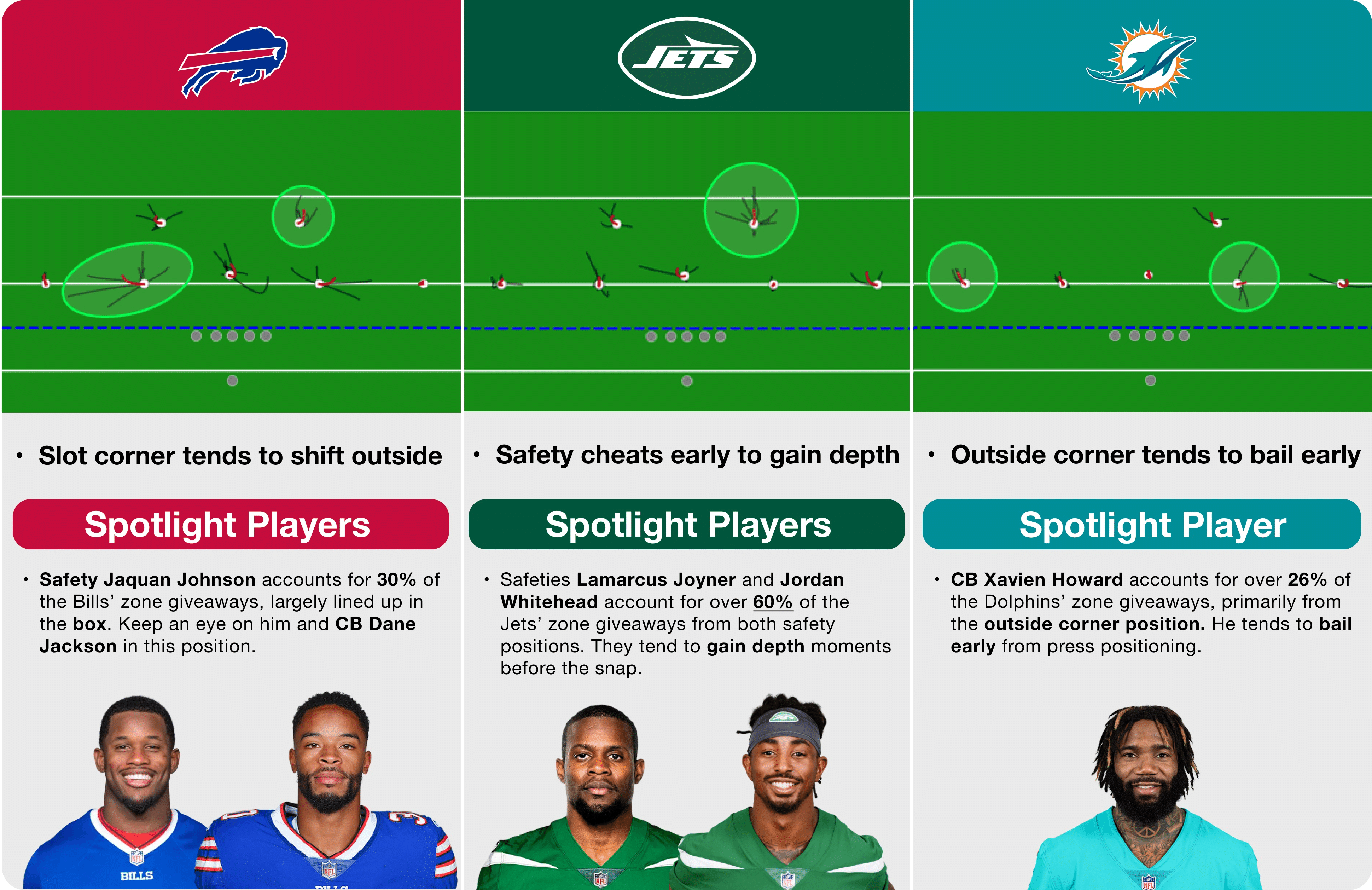さらに論文での解析は進み、チーム別で「どの選手に注目すればカバーを露呈しやすいか」まで出しています。「0.5秒以内に10%以上予測確率の変化が起きている例 = 特定の動きがカバーをわかりやすくしている例」を抽出して、その際に移動距離が大きかった選手を解析。「JetsならSの2人がdeepにシフトすることでゾーンカバーが想像でしやすい、MIAならCB Howardがプレスカバーからの動き出しが速いからdisguiseが分かりやすい」のような超実践的な情報が得られてくるそう。