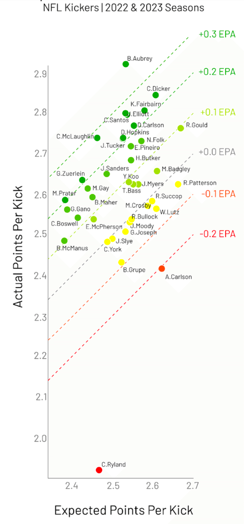も分かるので、差 (AP–EP)をとることによって、 **EPA (expected points added, 得点期待値加算) ** = 確率で予想されるより、どれだけFGを決めて得点を増やしたか = 選手のキッカーとしての貢献 が分かるわけです。