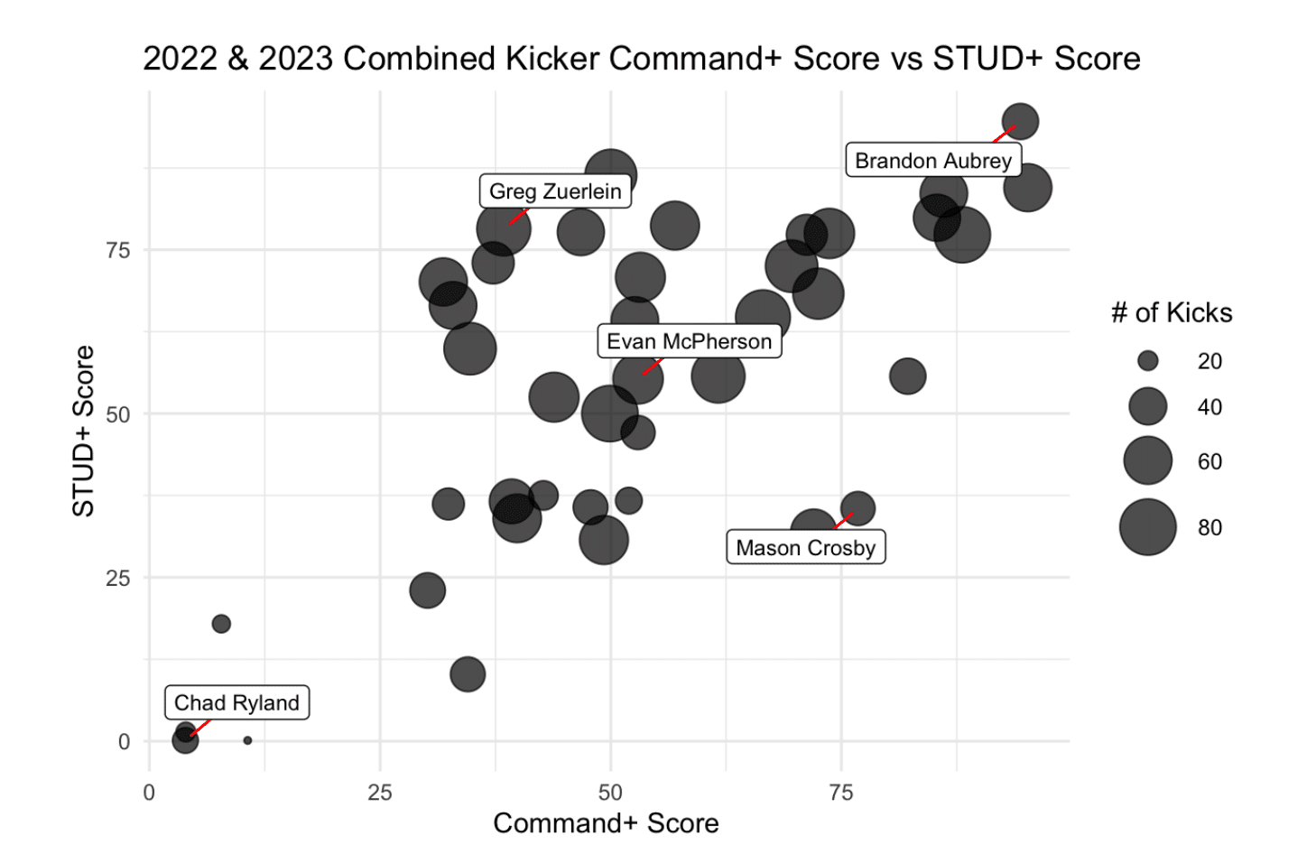 そして最後に、以上2つをまとめて、縦軸をSTUD+(難度調整した成功率)、横軸をCommand+(キックの質)でプロットしたもの(下図)を出しています。