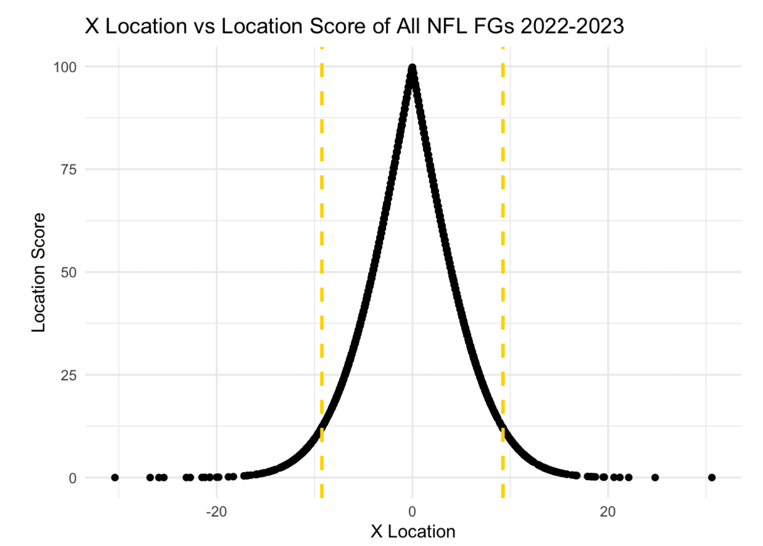 - 決めた/外したの2択ではなく、それぞれのキックには“質”がある (例) Justin Tuckerは真ん中から0.15ヤードのズレで通した決勝43ヤードは、Doinkして入った43ヤードと同じ質として扱っていいのか? といったように、同じ距離すら難易度が状況によって異なり、成功/失敗の二元論ではなくキックの質も区別したい。キッカーの実力を運の要素を排除して正確に語ろうとすると、(FG成功数)/(FG企図数)だけでは決められない複雑さがあるのが分かると思います。