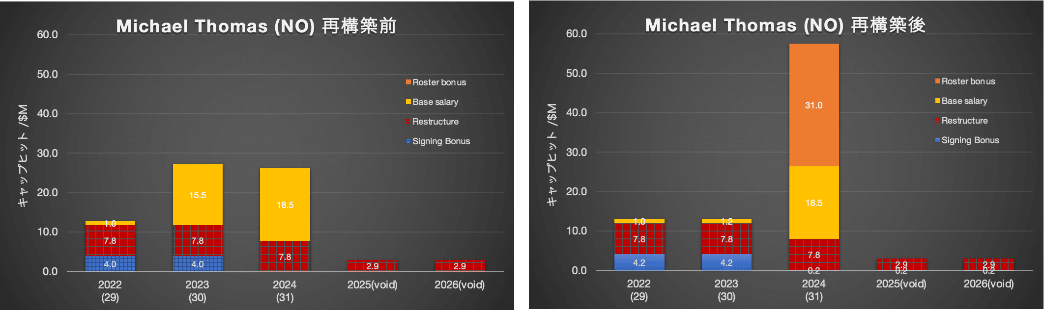しかし、Saintsのキャップ状況的にこの$25Mが2023年に全ヒットするのは避けたい。そこで**「post June 1 designation」制度を使います。 【Post June-1 designationとは】 NFLでは選手をカットした場合、 6/1まで: デッドマネーは全額その年にヒット 6/2以降: デッドマネーが2年に分割される(翌年以降分のデッドマネーは翌年にヒット)。 しかし例外的に、6/1までのカットでも年に2人は「6/2以降扱い」にできる。 https://www.the33rdteam.com/category/training-camp/explaining-june-1-salary-cap-implications-in-the-nfl/ Thomasの場合、6/1以降扱いにすれば、デッドマネーは2年に分割されて2023年が$11.8M、2024年が$13.8Mのヒット**になります。これなら大分楽。 (この手法は引退する選手とかでもよく使います。NOでもBreesが引退した際に2年に分割しました。)