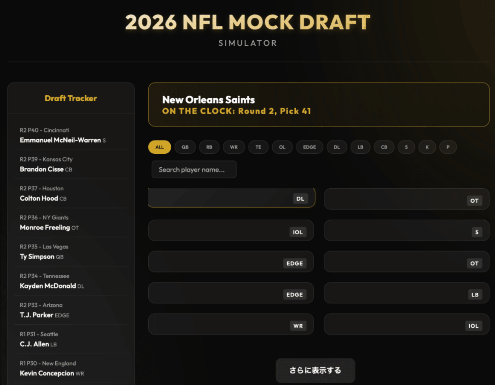 この時点で、一応出しても恥ずかしくないレベルのものはできたので、あとは使用感とかの向上を依頼。(ここからは指示のみ) 【指示8〜】 ・終了した後に指名した全選手一覧表が出る形にして ・終了した後に、最初の画面に戻るボタンをつけて ・開始する前に「Start 2026 NFL draft」とボタンを押してからスタートする形にして ・ドラフト中、次の自分の指名は何巡何位というのが上部に表示されているようにして。そして自分の番が来たら「You are on the clock!」という表示に変えて ・Pause Simulationの際に「resume simulation」「simulate pick」以外に「Trade up」のボタンを作る 。ただしトレードアップ機能を実装する必要はなく、「トレードアップは将来のドラフト指名権を消費します。再建中のチームにとってはリスクが高く、戦力の層を薄くする可能性があります。今回はトレードダウンまたはステイで、少しでも多くのタレントを指名する方針をおすすめします。」のようなエラーメッセージが出て戻るような指定にすればOK(複数作って) ・同様に、自分の番が来たときは「Trade down」のボタンを作って ・こちらもトレードダウン機能を実装する必要はなく「SaintsのGM、Mickey Loomisが過去に一度もトレードダウンをしていないのを知っていますか?このチームの哲学に反します。トレードダウンは却下されました。」という形のメッセージで戻して(複数作って) ・1巡でOTを指名しようとすると、2024年にTaliese Fuaga、2025年にKelvin Banks Jr.を指名したのにまたOT指名か、と文句をつけて指名させないようにして ・英語も良かったので、アプリに入る前に言語選択して日本語と英語選ぶようにしようか。日本語選んだ場合でも、message.jsのメッセージ系以外は全部英語でOKです。 ・Draft Lengthのデフォルトを1 roundにして ・San Francisco 49ersを選んだ時だけは、一定の理解を示しつつ、今回はSaints専用のmock draft simulatorを開発したため49ers対応できていないのを申し訳なく思っている旨を説明してください ・Ready for the Draft?You are about to start the 1-round 2026 NFL Draft as the General Manager of the New Orleans Saints. の部分は日本語対応をお願い という指示で完成。