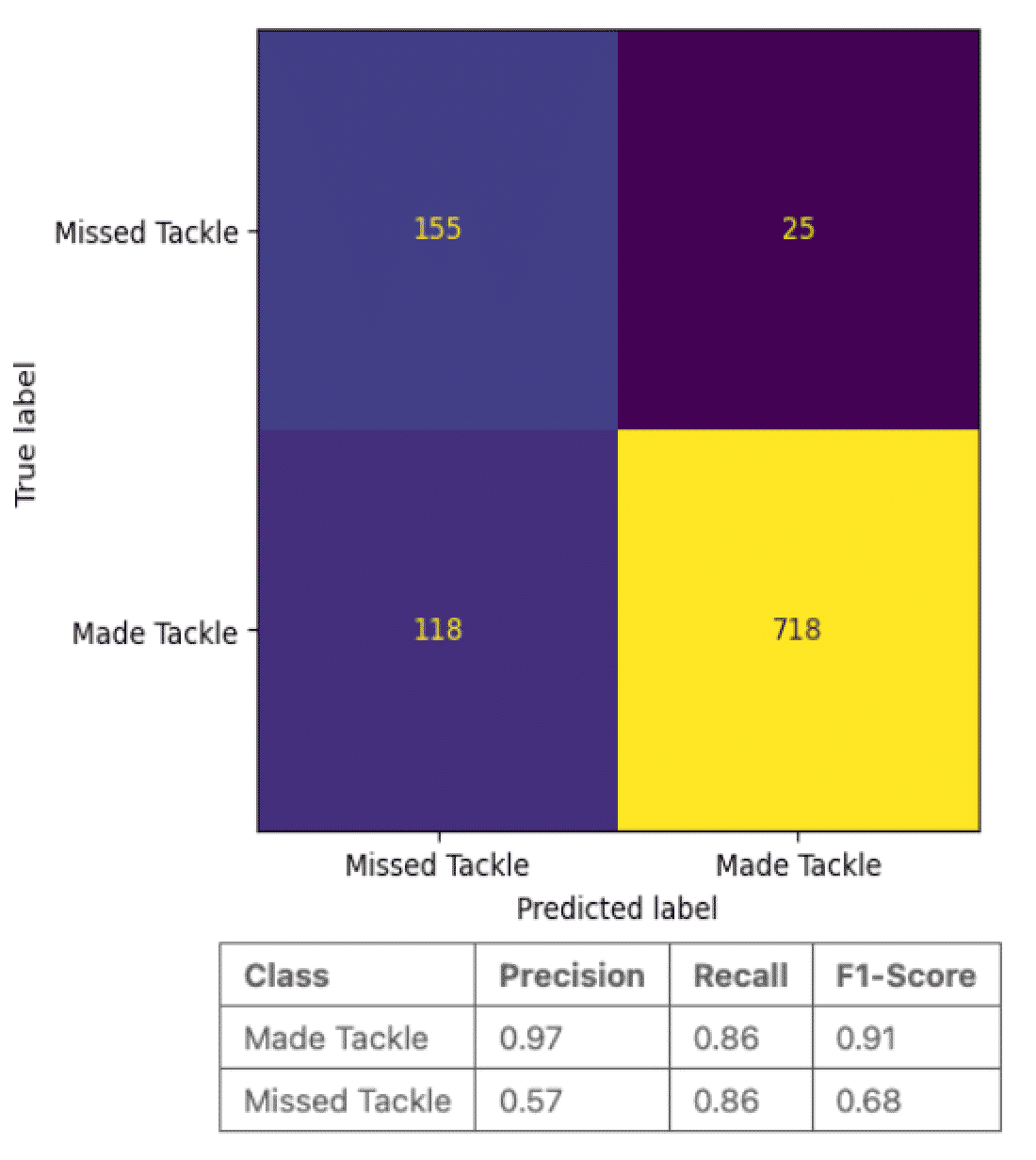 モデルが「タックル成功」と予測した場合は97%の確率で実際にタックル成功、モデルが「タックル失敗」と予測した場合は57%の確率で実際にタックル失敗。後者の精度はやや低いが、今回はミスタックル(成功率が高いのに失敗するケース)を調べたいので問題なし(https://www.kaggle.com/code/matthewpchang/uncovering-missed-tackle-opportunities/ より)