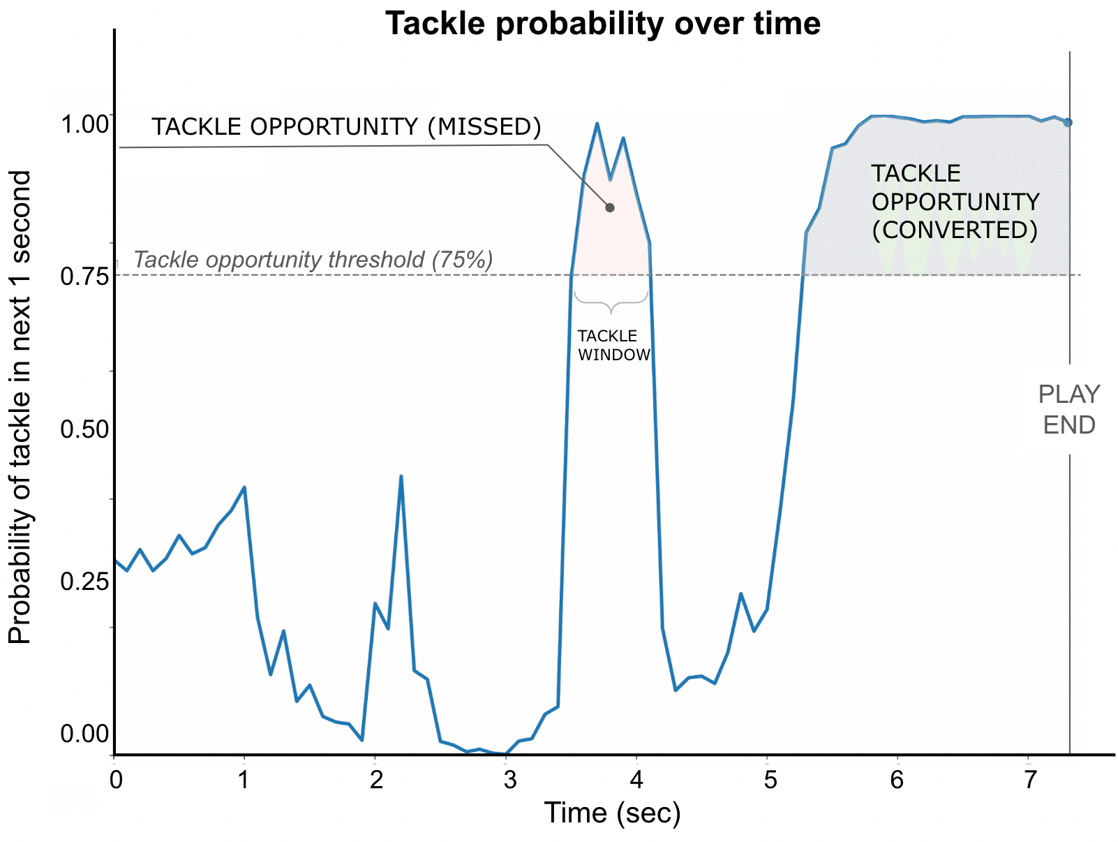プレー開始4秒付近に注目してください。ここではタックル成功率がほぼ100%に近いところまで上がったのに、その後下がっています。これが「ミスタックル(タックル成功率が高いのにタックルできずに逃した)」だと考えることができます(今回の研究では、著者は「75%以上のタックル成功率が0.5秒以上続いたが取り逃がした」のを「ミスタックル」と定義しています)。