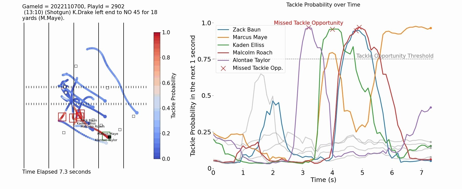 左:選手の2次元座標データ、右:各選手の時間別タックル成功率(https://www.kaggle.com/code/matthewpchang/uncovering-missed-tackle-opportunities/ より) これをプロットすると上図のようになります。確かに、最初タックルをかわされたDonald(緑)のミスタックルが1.5秒に観測され、次にRamsey(オレンジ)が追いつき、動きを止めている間に青のJonesがタックルに成功して止まった、というのがグラフを見るだけで分かります。(RamseyもJonesもミスタックルしていないのは、タックル成功率がこの後下がっていないことで分かる) 2つ目は2022年Week9のNO-BAL。こちらは動画付きで、BALのKenyon Drakeが大量にタックルをかわしながら18ヤード獲得したプレー。グラフのように**Taylor (紫), Ellis (緑), Roach(赤)とBaun(青)、という順に山があってミスタックルが分かります。**ファンとしては見ていて辛い。