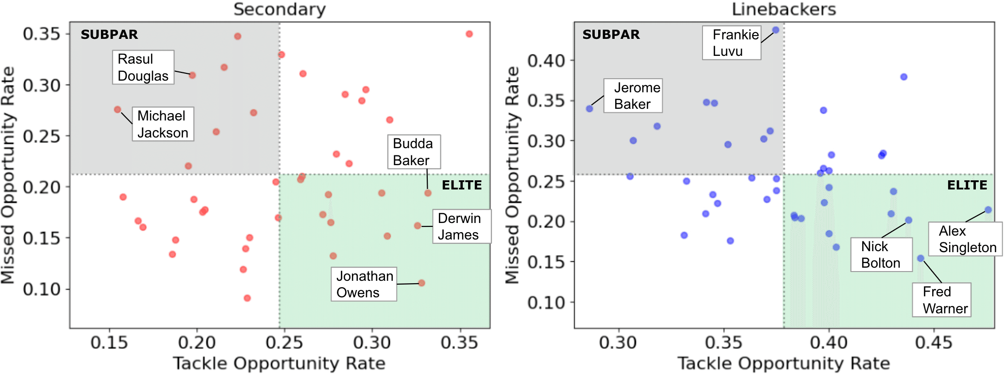 左:CBとS、右:LB。横軸がタックル機会率、縦軸がミスタックル率 (https://www.kaggle.com/code/matthewpchang/uncovering-missed-tackle-opportunities/ より)