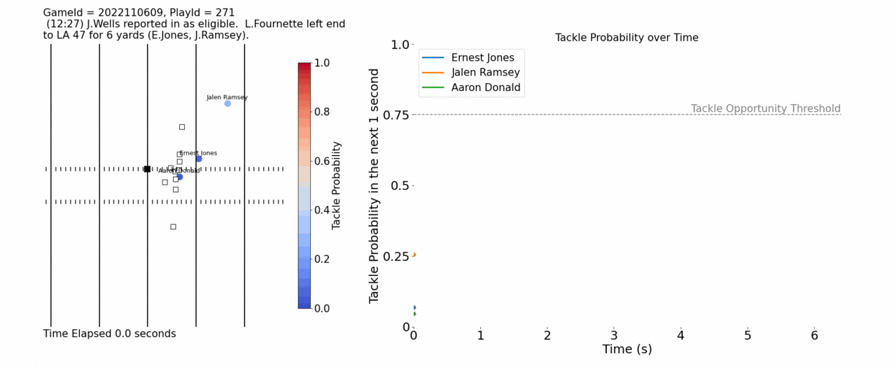 まだ分かりにくいということで、研究では具体例を挙げてくれています。 1つ目は2022年Week9のTB-LAR。割と普通のプレーですが、**TBのRBのLeonard Fournetteが左へのランでAaron Donaldをかわして、Jalen Ramseyと接触後に最後はErnest Jonesが追いついて倒された(6ヤード獲得)**というプレー。